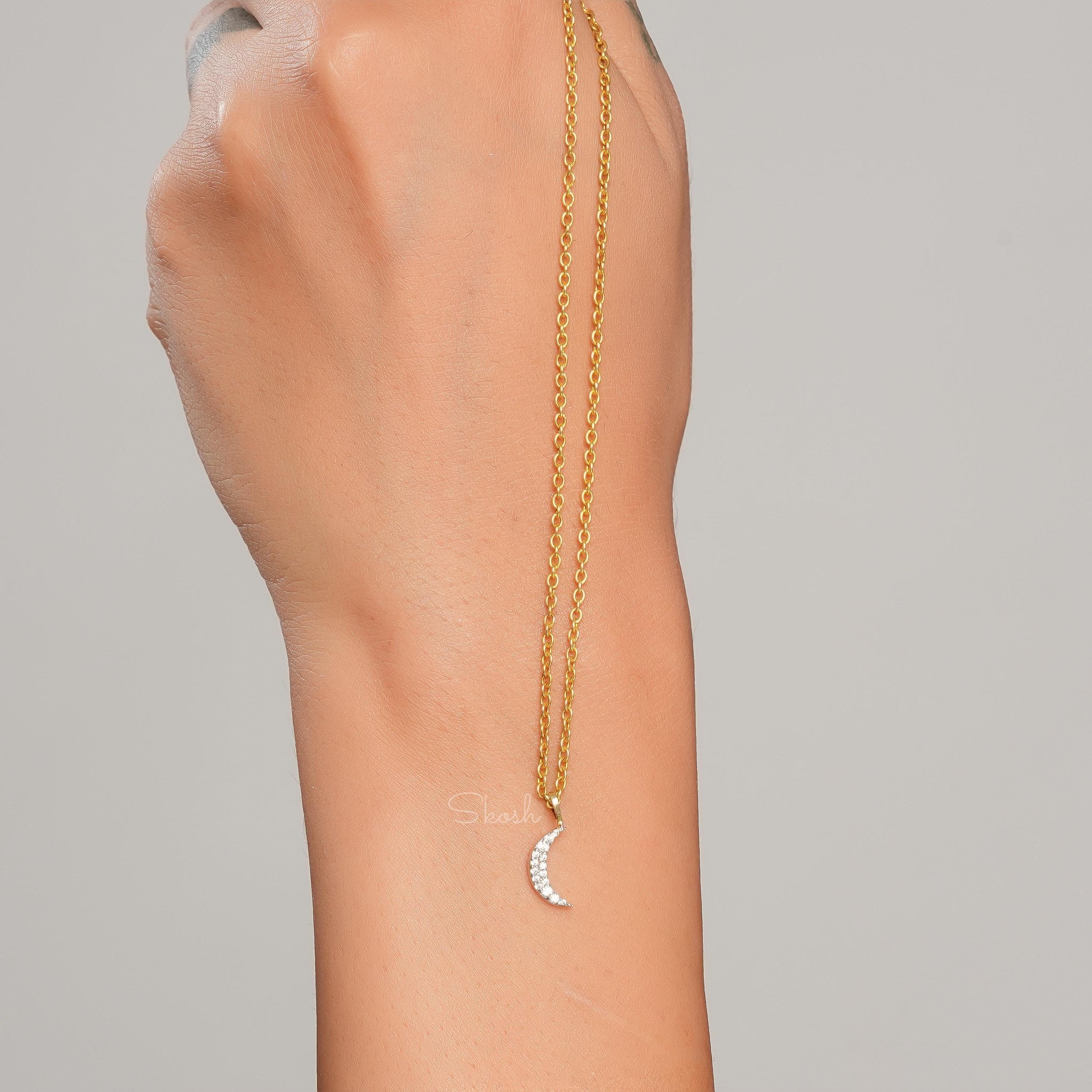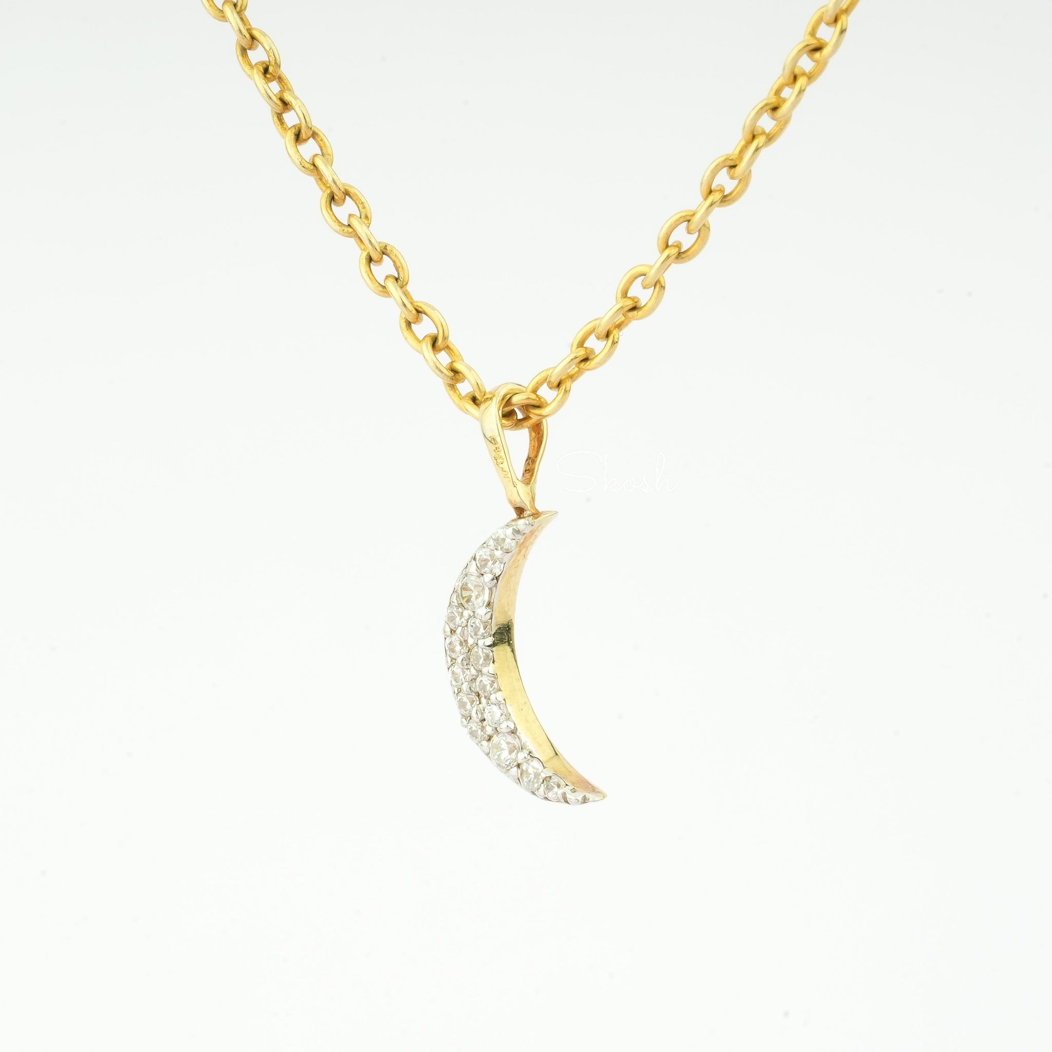 Embrace celestial beauty with the Crescent Moon Diamond Charm Pendant. This enchanting necklace features a gracefully curved crescent moon adorned with sparkling lab-grown diamonds, symbolizing dreams and the night sky. Set in 14Kt solid gold, this pendant is an ideal choice for brides or as a thoughtful wedding gift. The celestial design, paired with the brilliance of the diamonds, creates a timeless piece that adds a touch of magic to any jewelry collection. Available in white, yellow, or rose gold, it’s perfect for those who seek elegance with a cosmic twist.
