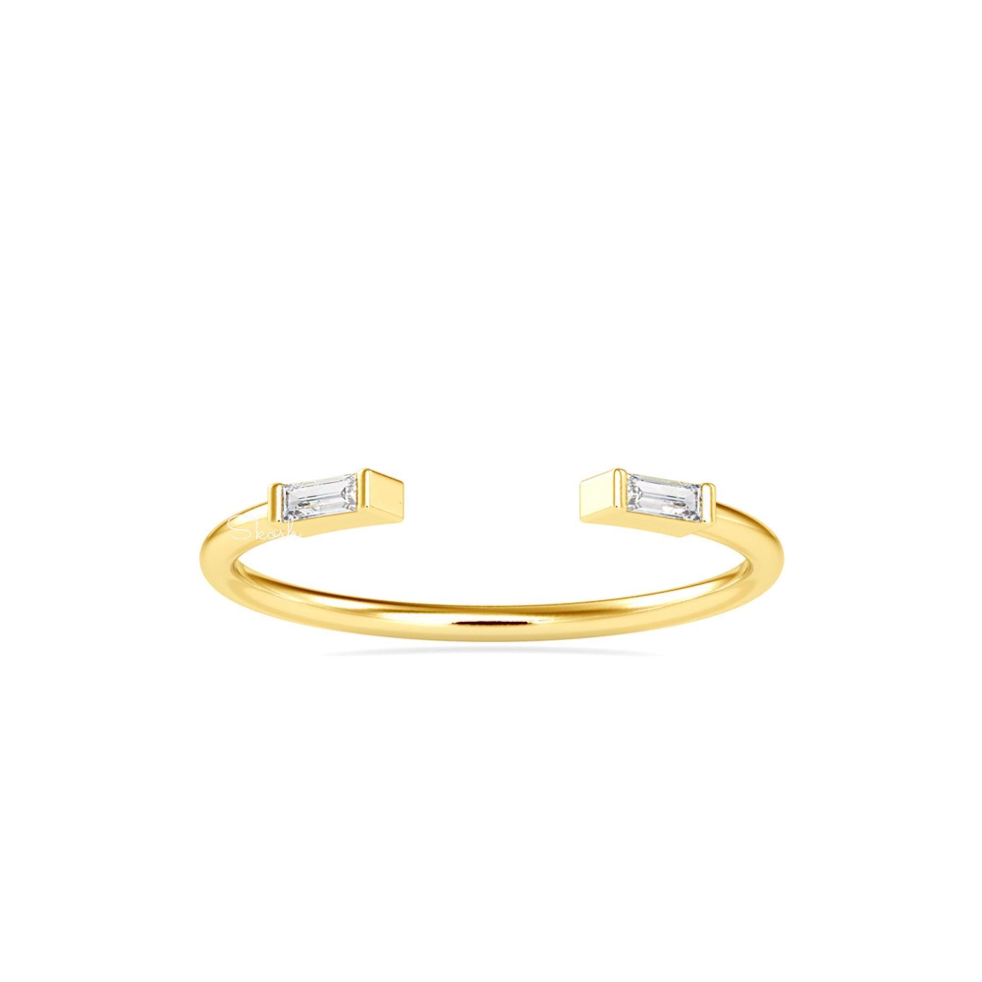 This sleek and modern ring features two baguette-cut diamonds in an open cuff design, creating a minimalist yet elegant look. Crafted in 14k solid gold, this versatile piece is perfect as a wedding band, dainty cuff ring, or a stacking diamond ring for a chic layered style.