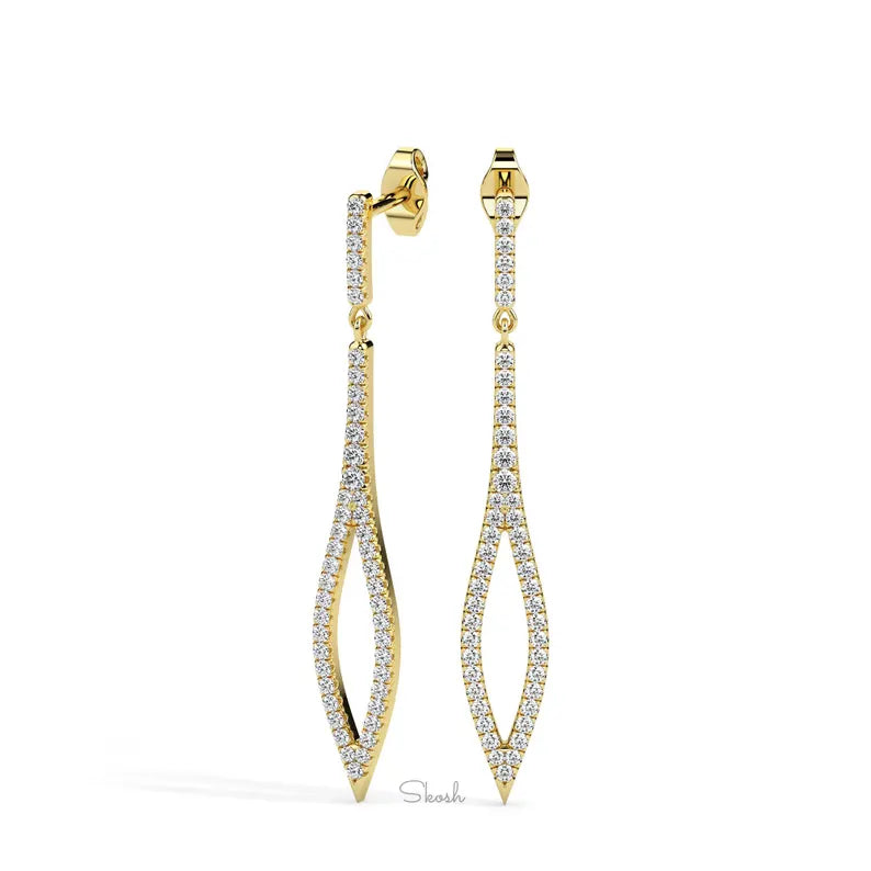 Make a bold statement with these stunning 14kt Solid Gold Drop Bridal Diamond Dangle Earrings, designed to captivate with their timeless elegance. Featuring three sparkling solitaire lab-grown diamonds aligned in a straight line at the top, and a tear drop shape filled with brilliant diamonds, these earrings are the perfect accessory for brides or a meaningful anniversary gift for her.