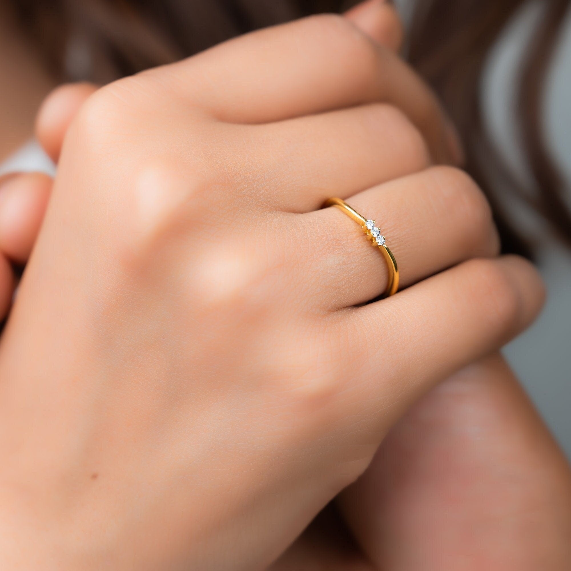 Minimal 3 Diamond Wavy Stacking Ring, Lab Grown Diamond Ring, Promise Ring - Dainty 14kt Solid Gold Jewelry This Minimal 3 Diamond Wavy Stacking Ring offers a fresh twist on a classic design. Crafted from 14k solid gold, it features three lab-grown diamonds set on a uniquely wavy shank, adding a subtle yet stylish edge. Perfect for those who appreciate timeless elegance with a modern touch, this dainty ring stands out from the crowd, making it an ideal promise ring or addition to any stacking collection.
