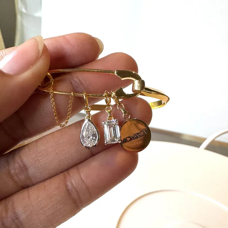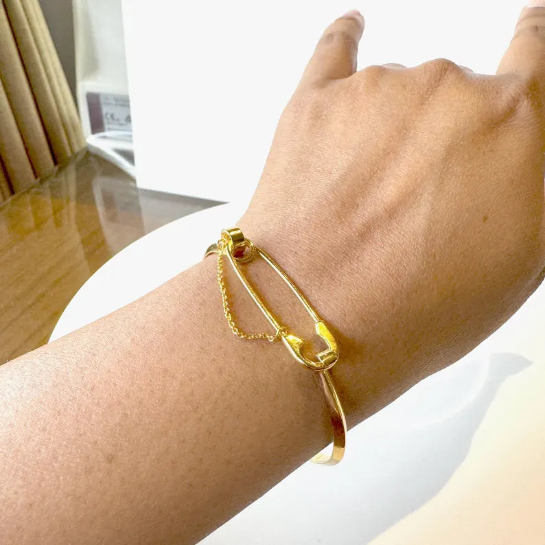 Make a bold statement with this 14kt Solid Gold Safety Pin Cuff Bracelet, a modern yet timeless piece of luxury jewelry. Designed for versatility, this bracelet can be styled your way—wear it as a sleek, minimalist cuff or elevate it with diamond charms to create a personalized, unique look.