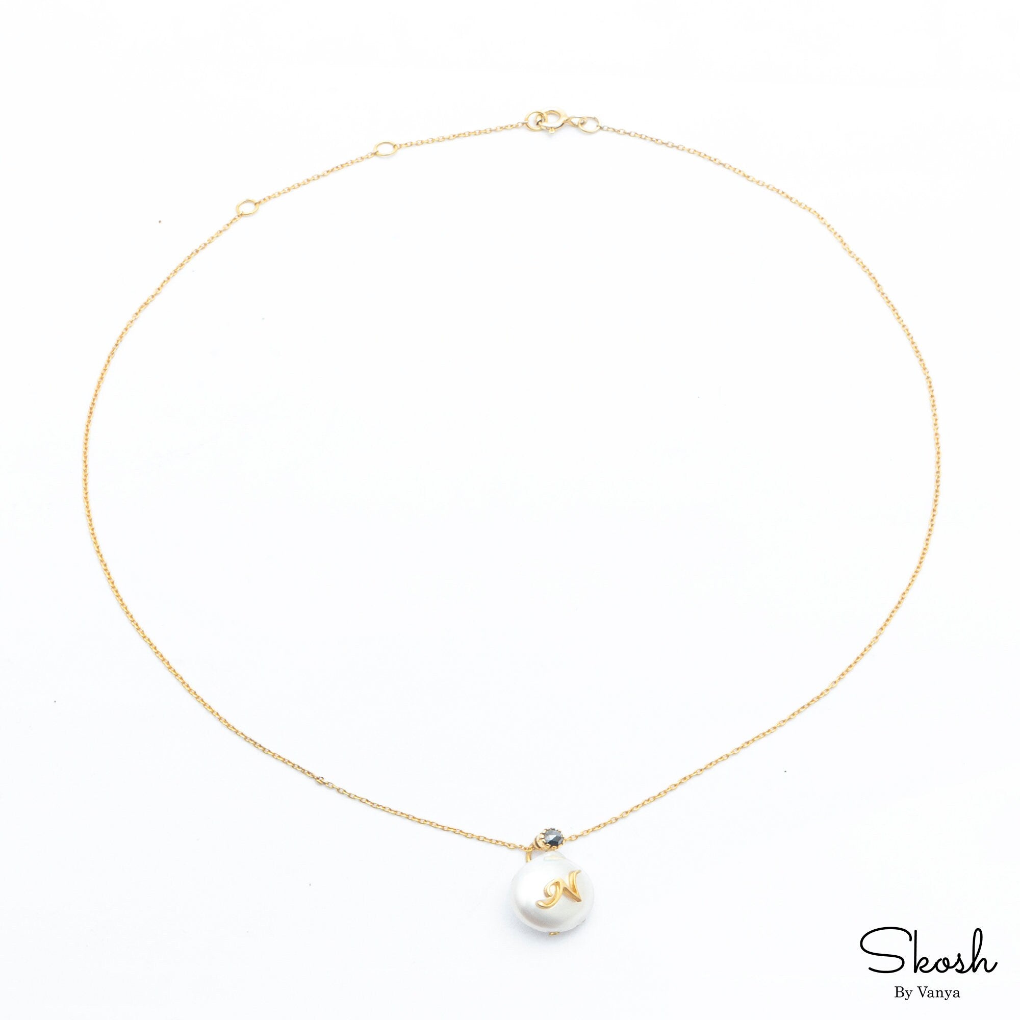 This is a beautiful, personalized pearl and diamond necklace in solid 14kt gold. The necklace is made of freshwater pearl, with your personalized alphabet in 14kt sold gold. To further elevate the necklace, the pearl is topped with a handpicked, handcut rosecut diamond.