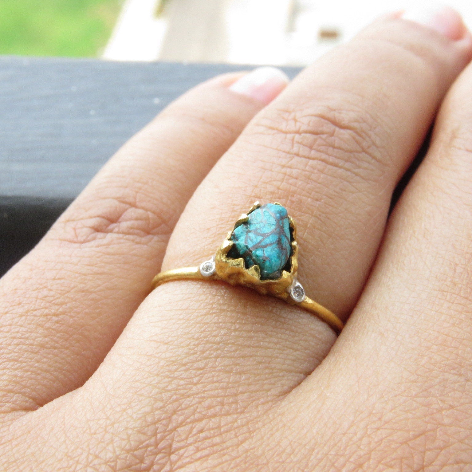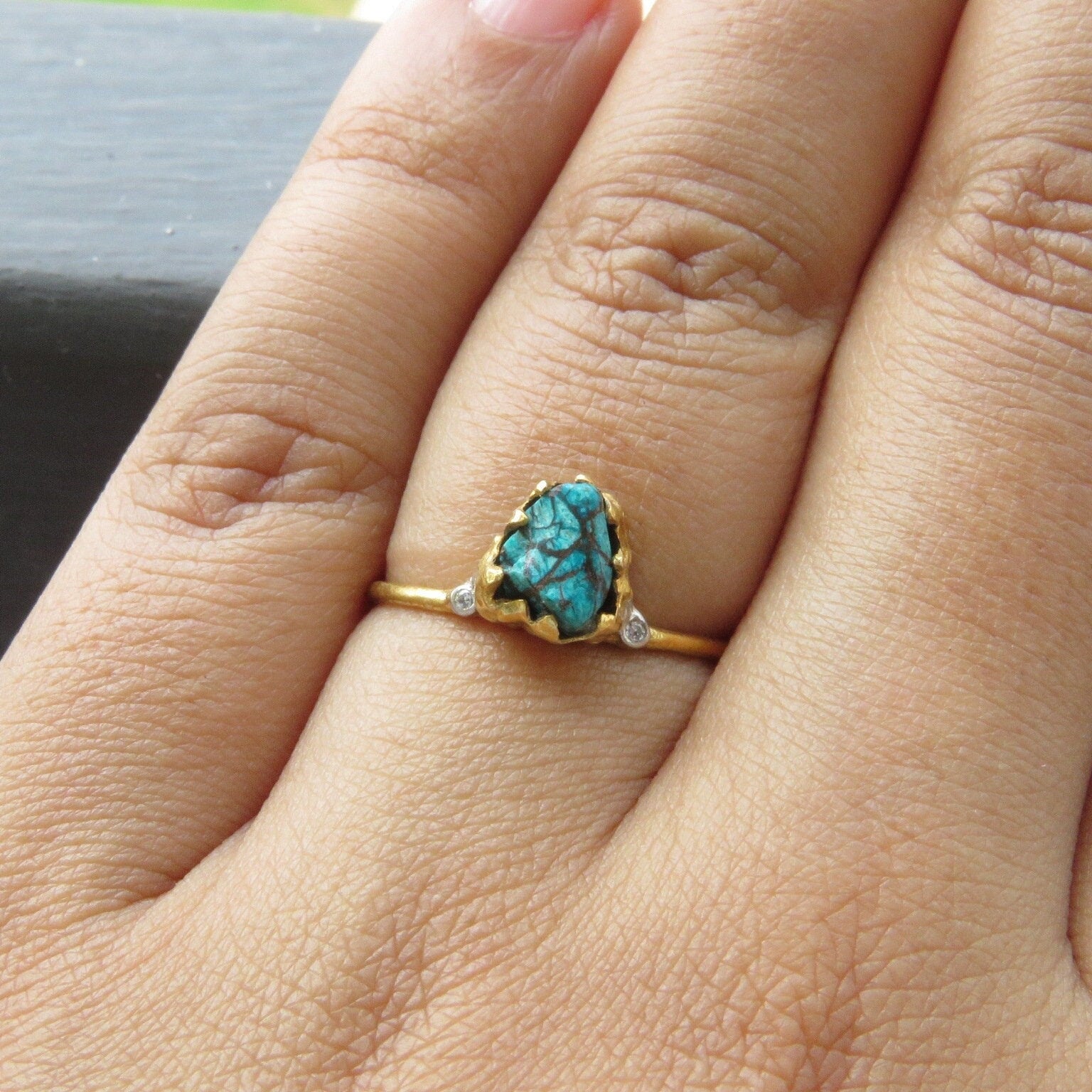 Natural Raw Turquoise & Diamond Solitaire Ring
